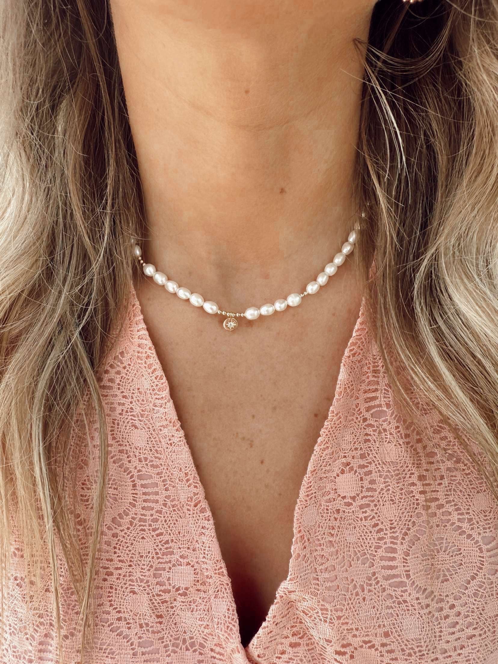 Look chic and summery with this beaded pearl necklace! Featuring golden accents and a lovely star pendant, this necklace is perfect for layering with other pieces for a unique and stylish look.